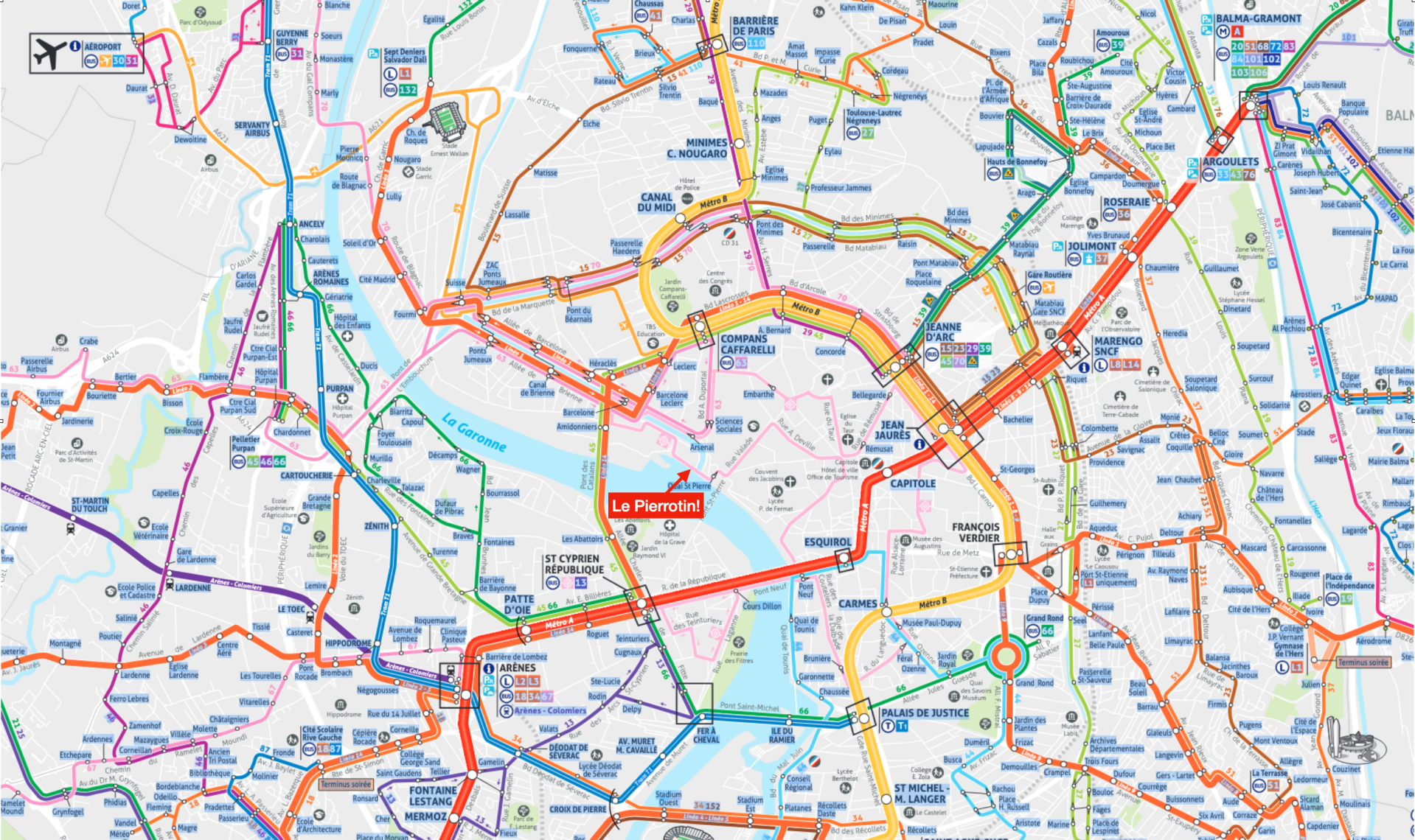 Toulouse is not a great place to have a car, and given that the location of Le Pierrotin means that you can reach most sites on foot or using the extensive Bus, Tram and Metro network as shown in this plan.